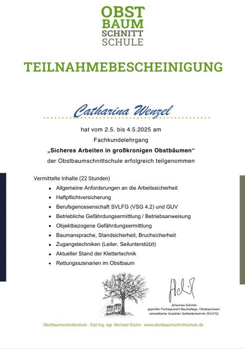 Da mein Wissensdurst und Schaffensdrang noch lange nicht gestillt sind, habe ich in der Obstbaumschnittschule 2025 die einjährige Ausbildung mit 172 Stunden zum Obstbaumwart mit Gesamtnote 1,8 beendet und freue mich auf die ca. 150 Stunden umfassende zweijährige Vertiefung der Ausbildung bis 2026.